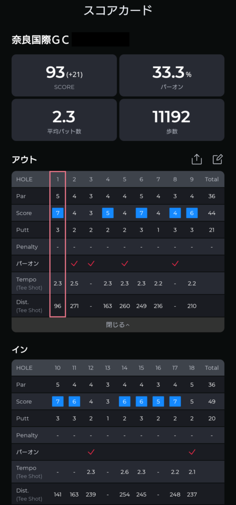 さて、気になるスコアを報告します。 INコースが49でした。 そして、OUTコースが44でした。 つまり、トータル93というまずまずの結果でした。 OBはゼロでした。 池ポチャも1回のみに収まりました。 ショット自体は、まずまず安定していました。