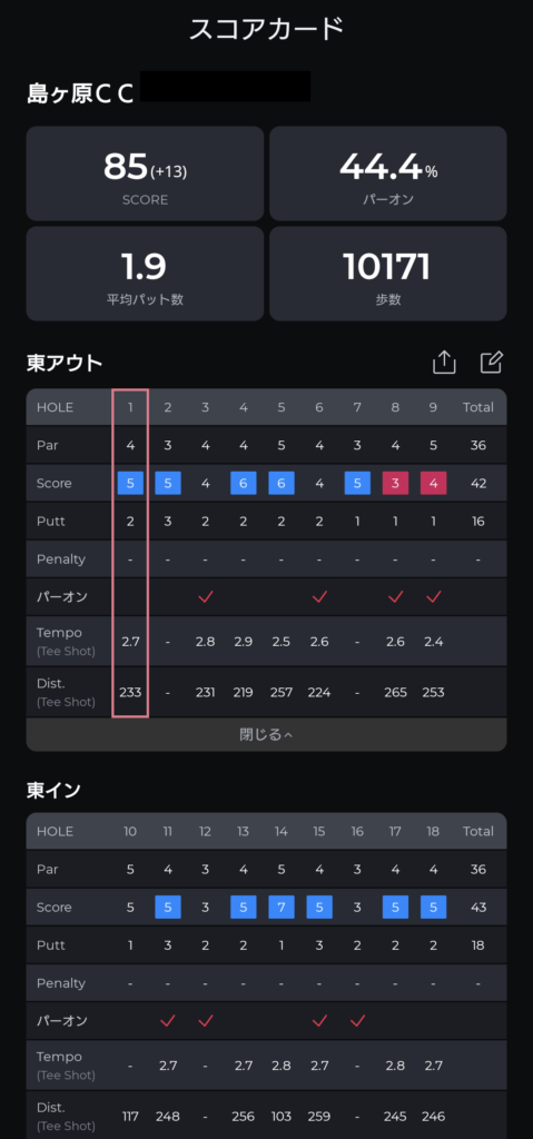 その他のミスとしては、セカンドでFWが引っかかって隣のホールへ行ってしまったことが挙げられます。 加えて、3パットが3回ありました。 したがって、パッティングの精度を上げることが、次回の明確な課題となります。